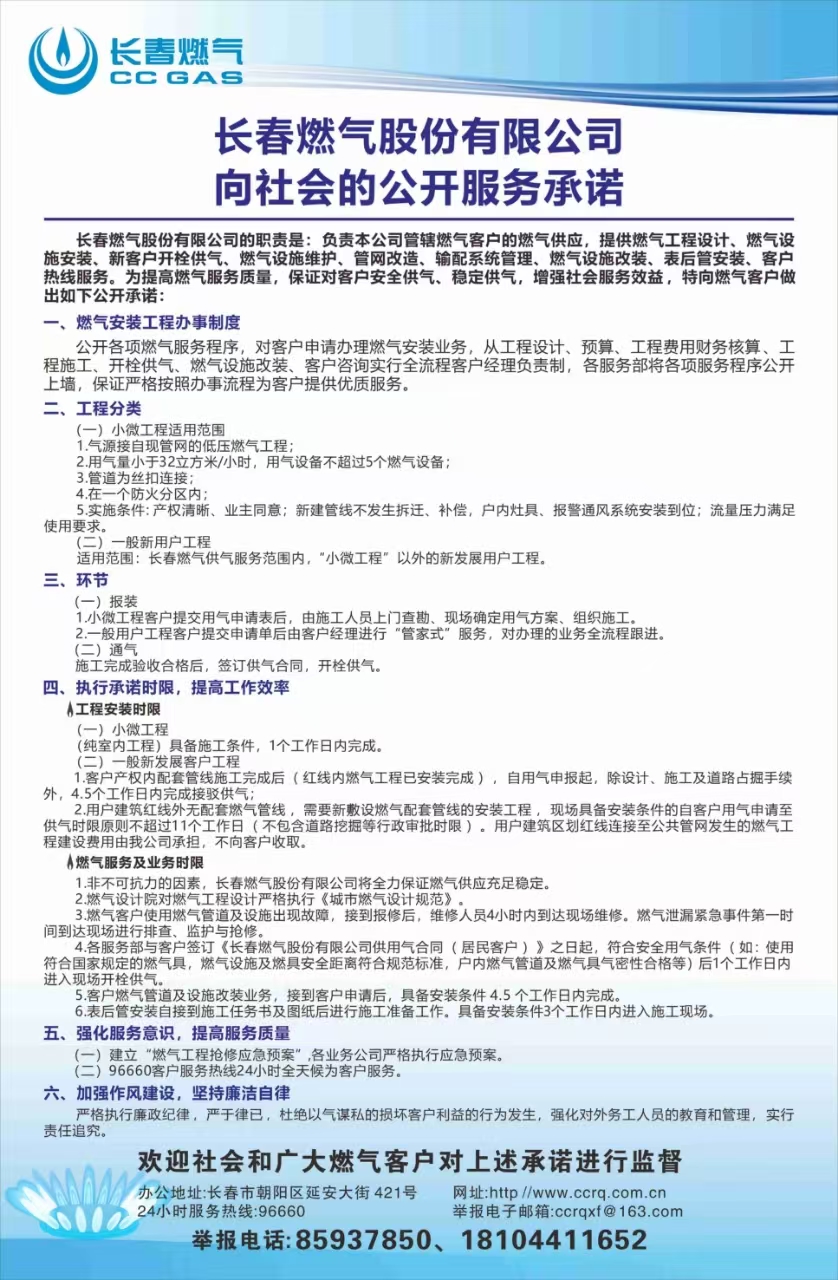 長(zhǎng)春燃?xì)夤煞萦邢薰鞠蛏鐣?huì)的公開服務(wù)承諾,詳情請(qǐng)見(jiàn)附件!